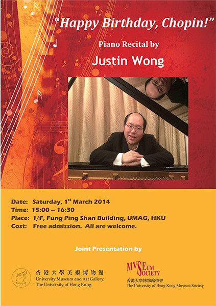On the anniversary of Chopin's birthday, Justin Wong will give a brief introduction about Chopin's life and works, and why he remains one of the most performed composers for pianists up until today. This will be followed by a recital of a selection of Chopin's piano pieces, as well as some pieces inspired by him.